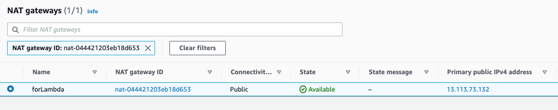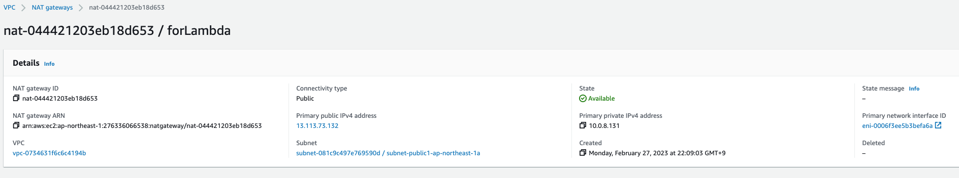 정리하자면 아래 순서대로 확인하여 Lambda가 사용하는 NAT gateway의 고정 IP 값을 알아낼 수 있다.