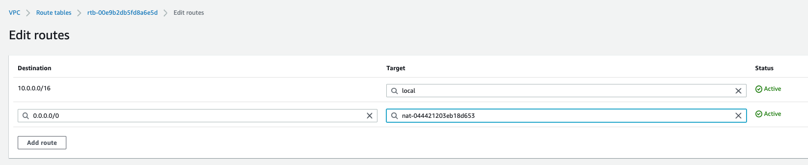 Route Tables에 들어가서 routes를 방금 생성한 NAT로 변경한다.