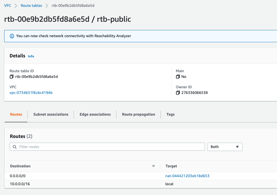 하단 부 Routes의 0.0.0.0/0의 타겟이 위에서 생성한 NAT가 되어 있는 것을 확인한다.