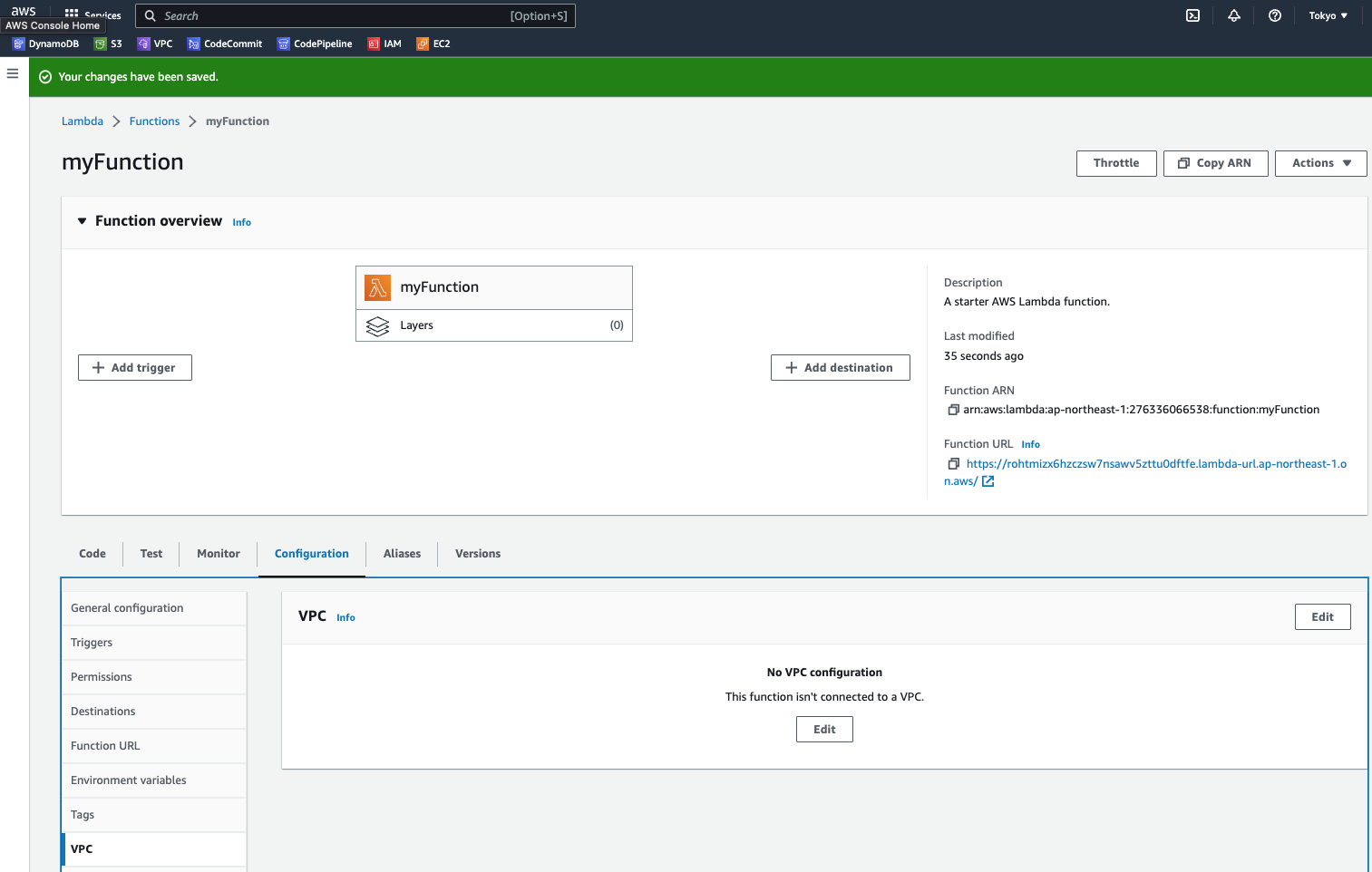 Lambda 상세페이지에 들어가면 Configuration 탭이 있다. 여기서 VPC를 보면 No VPC Configuration 으로 특별히 네트워크 구성이 이뤄져있지 않다.