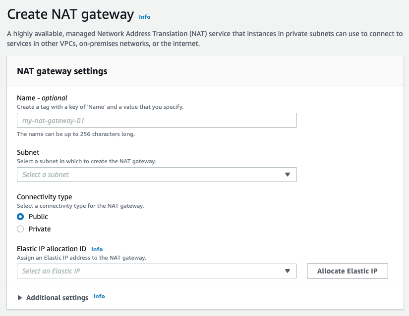연결할 Subnet을 고른 후 Connectivity type은 Public, 그리고 Elastic IP allocation ID에는 Elastic IP를 지정(없을 시 생성)한다.